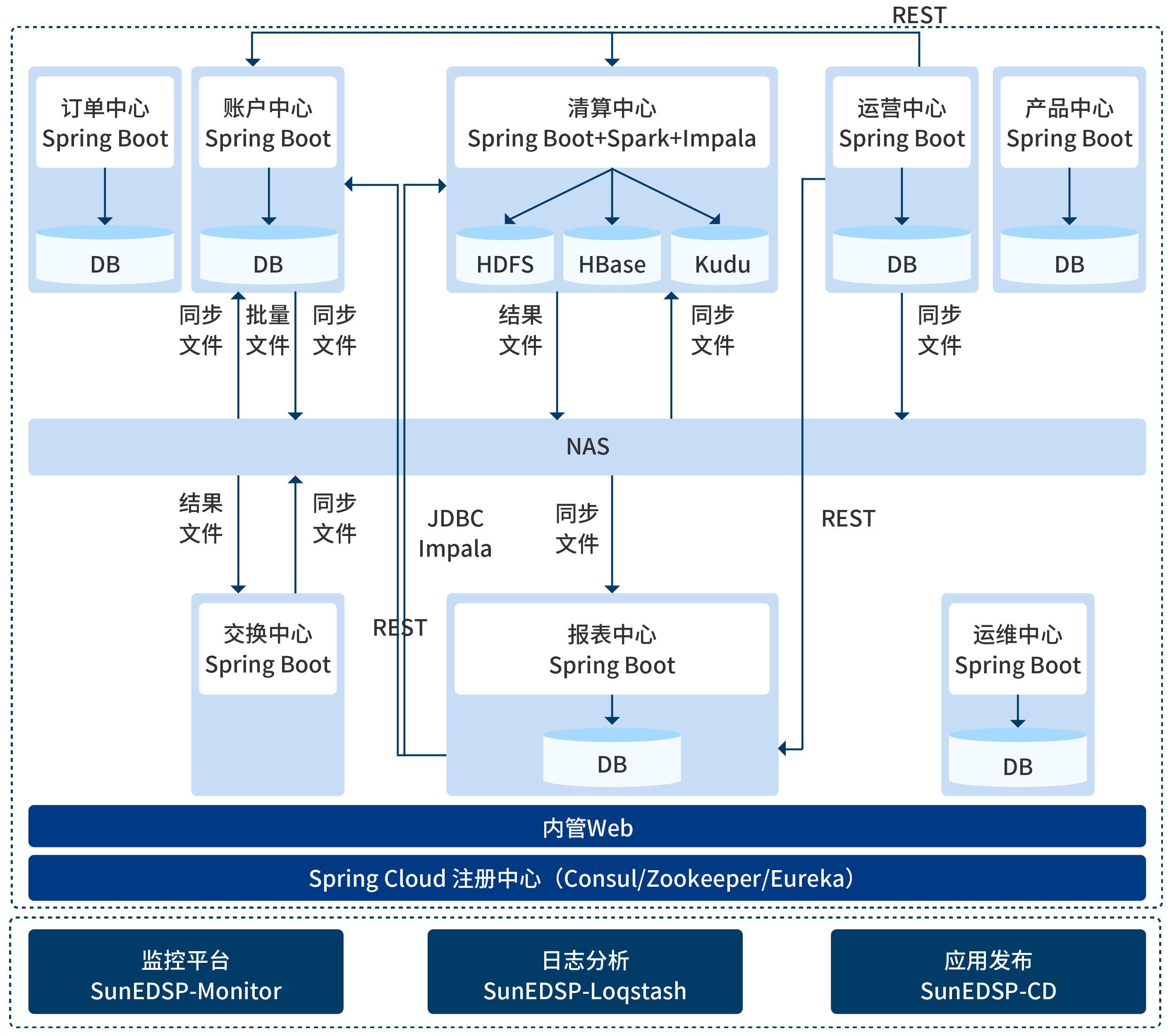 基于對接金融機構的業務場景和運營經驗,采用微服務系統架構設計,通過敏捷的開發模式驅動和先進的技術體系,搭建包括清算中心、訂單中心、賬戶中心、運營中心、交互中心、報表中心在內的一體化服務系統,提高清算系統的吞吐量、并發數和響應速度,實現流程監控簡單、可控。
